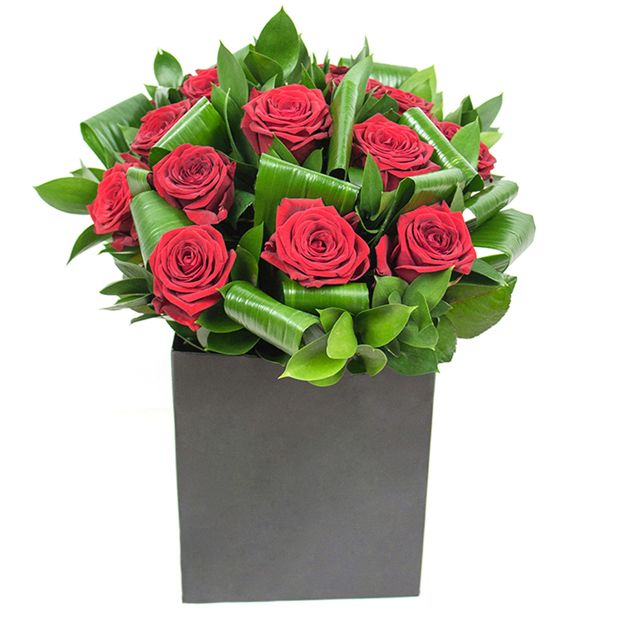 Discover the refined elegance of our floral design, featuring exquisite red roses, lush aspidistra leaves, and delicate ruscus. This beautiful arrangement brings a touch of sophistication and grace to any setting.