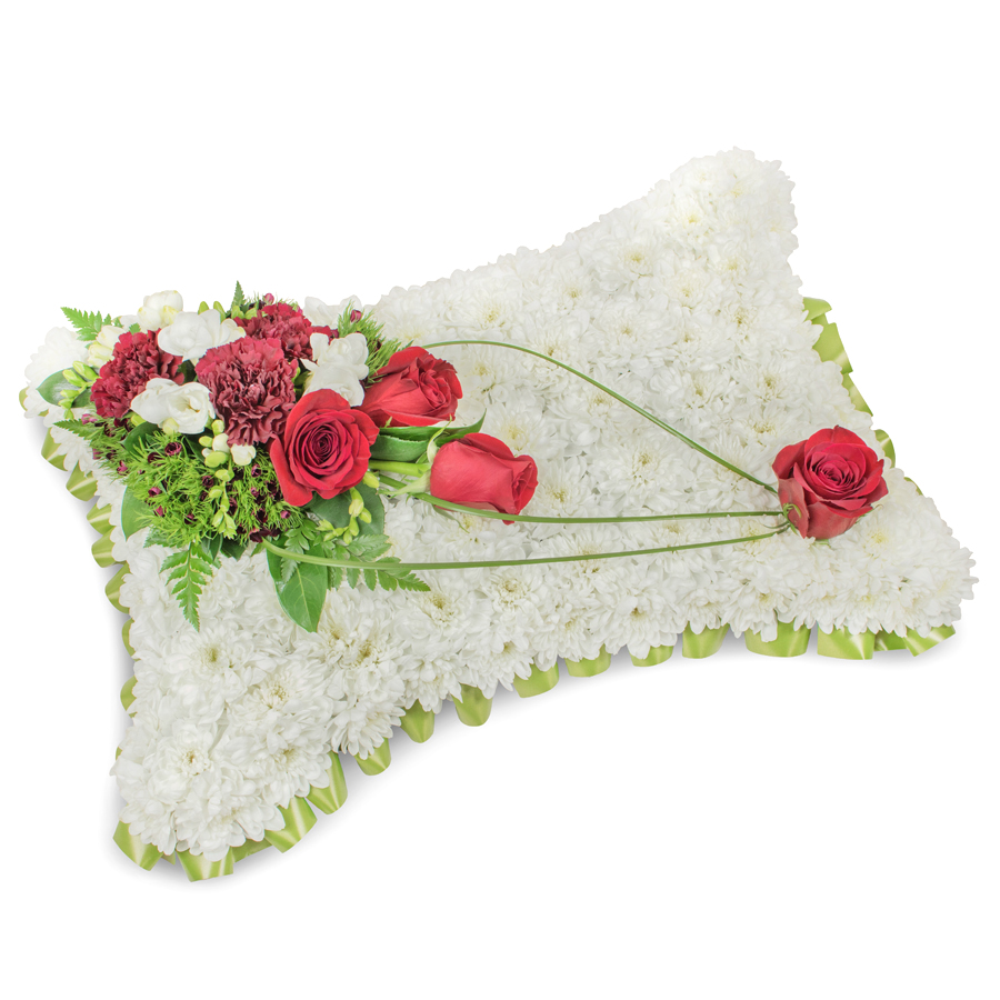 Share your sincere condolences with our refined bouquet, consisting of white chrysanthemums, beautiful red roses, lovely white freesias, and rich dark red carnations. Accented with dianthus and bear grass, this arrangement offers a unique blend of elegance and sympathy.